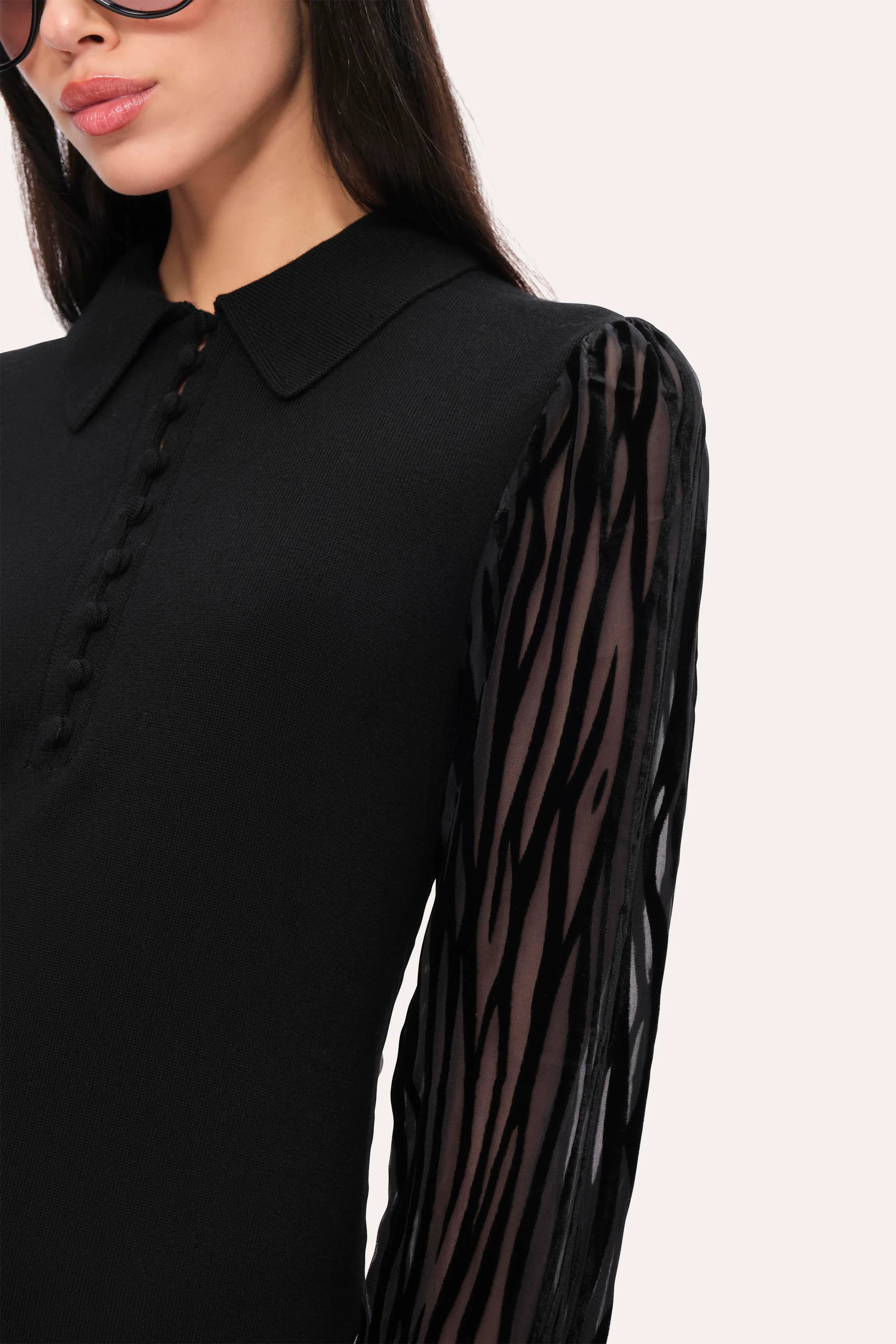 Inspired by the classic polo sweater, our take features long sleeves and a velvet burnout pattern that's balanced by satin loop buttons. Skip the accessories and let the built-in embellishment speak for itself.