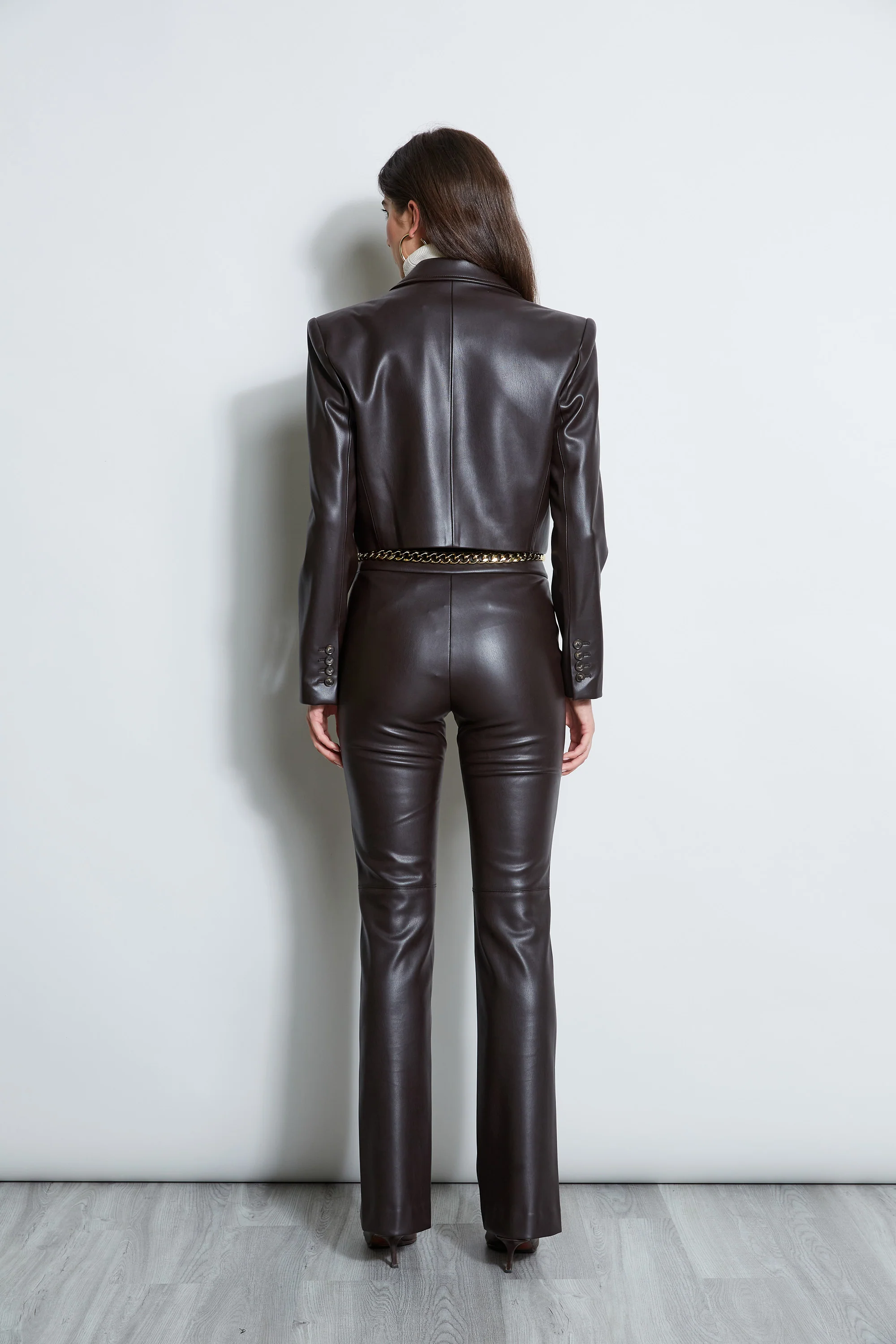 Meet the next "it " blazer. Cropped, bold shouldered, with stacked buttons sleeve detail, it has the ultimate cool factor! Designed in our Luxe Vegan Leather, Elie loves it paired as a suit with its matching vegan leather pant or skirt or as a great item jacket throughout your wardrobe.
