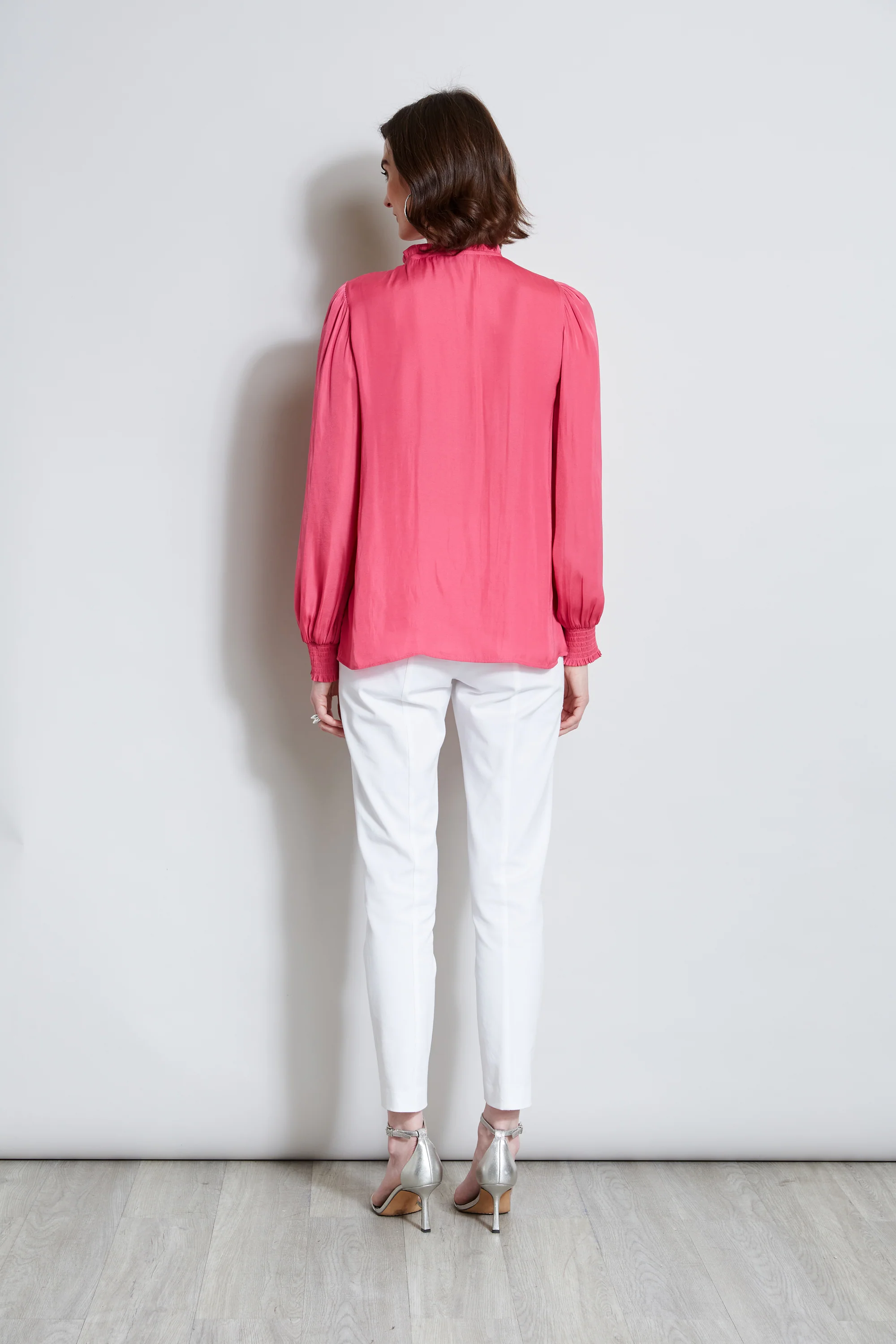 It's all in the details. Romantic & feminine, our poetic shirt features a softly pleated neckline, raglan sleeves and easy silhouette. With its long blouson sleeves, smocked cuffs and embroidered keyhole neckline fastened with a self tie, this style is a year-round essential.