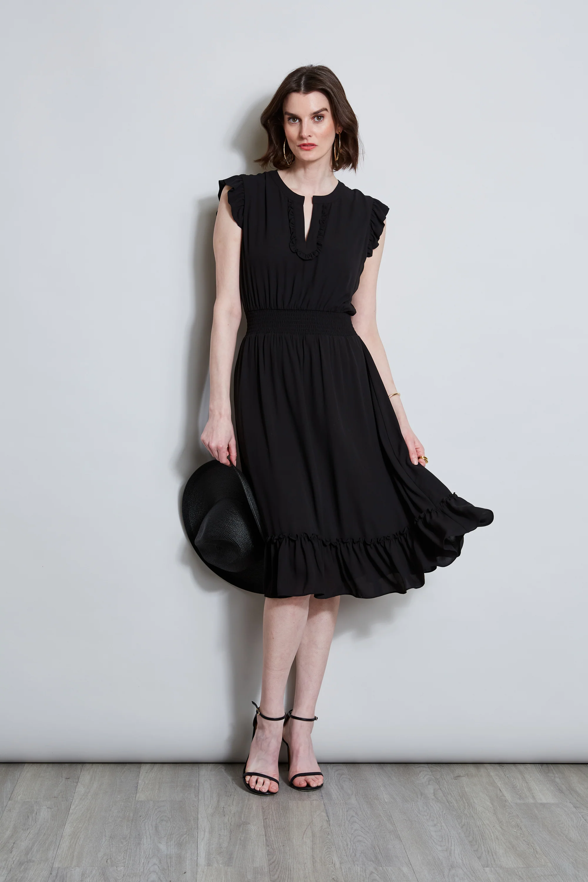 It's all in the details. Romantic & feminine, our midi dress features ruffle detailing throughout & a smocked twist. With its soft flutter sleeves, v-neckline & a split neckline, this LBD is an effortless one & done.