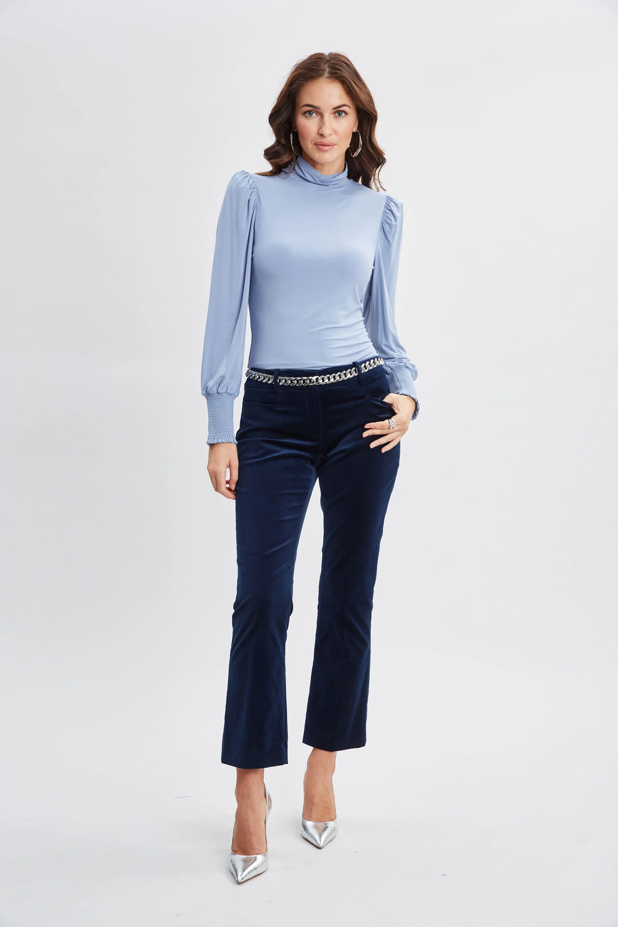 Refined and sophisticated, this Luxe Stretch Jersey Long Sleeve Turtle-Neck Knit features smocking at the cuff; lends a feminine twist to this essential Tee.